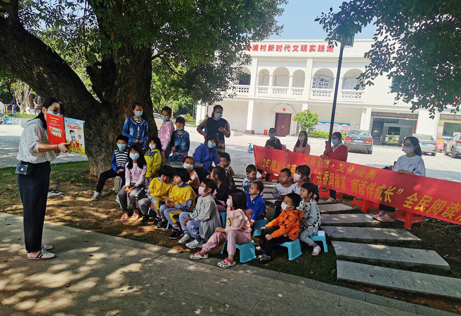 孩子們在新時代文明實踐站前的樟樹下朗讀。