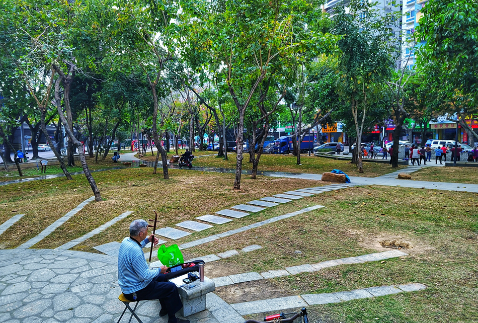 每天下午三時(shí)至五時(shí),在市區(qū)上排龍豐公園,總能看見72歲的市民鄧光宏在玩樂器的身影!斑@個(gè)口袋公園環(huán)境很好,我和一幫老朋友在公園里休閑娛樂也很盡興!