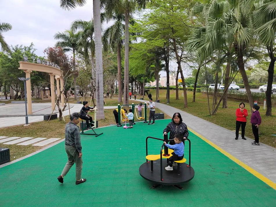 荷香園的兒童游樂區(qū),家長(zhǎng)帶著孩童嬉戲玩耍。