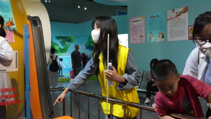 19歲的黃祖桐也是利用假期來(lái)做志愿服務(wù)的,她負(fù)責(zé)的是“生命科學(xué)”展區(qū),這里有多個(gè)互動(dòng)項(xiàng)目,吸引許多小朋友來(lái)體驗(yàn),人多的時(shí)候黃祖桐就要不停走動(dòng)維持秩序,還要提醒孩子們文明參與,不要爭(zhēng)搶!耙惶7個(gè)小時(shí)基本上都要不停走動(dòng),也是挺累的!秉S祖桐說(shuō),但是能幫助到別人,看到大家玩得開(kāi)心,自己也覺(jué)得開(kāi)心。