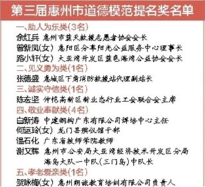 為深入貫徹落實(shí)習(xí)近平新時(shí)代中國(guó)特色社會(huì)主義思想,大力培育和踐行社會(huì)主義核心價(jià)值觀,充分發(fā)揮道德模范榜樣示范作用,弘揚(yáng)中華傳統(tǒng)美德,培育時(shí)代新風(fēng)新貌,不斷提高人民思想覺(jué)悟、道德水準(zhǔn)、文明素養(yǎng),爭(zhēng)做崇高道德的踐行者、文明風(fēng)尚的維護(hù)者、美好生活的創(chuàng)造者,形成崇德向善、見(jiàn)賢思齊、德行天下的濃厚社會(huì)氛圍,經(jīng)組織推薦、遴選審核、媒體公示、評(píng)委會(huì)評(píng)審?fù)ㄟ^(guò),鄧文進(jìn)等10名同志獲評(píng)第三屆惠州市道德模范榮譽(yù)稱號(hào),余紅兵等10名同志獲評(píng)第三屆惠州市道德模范提名獎(jiǎng)。
