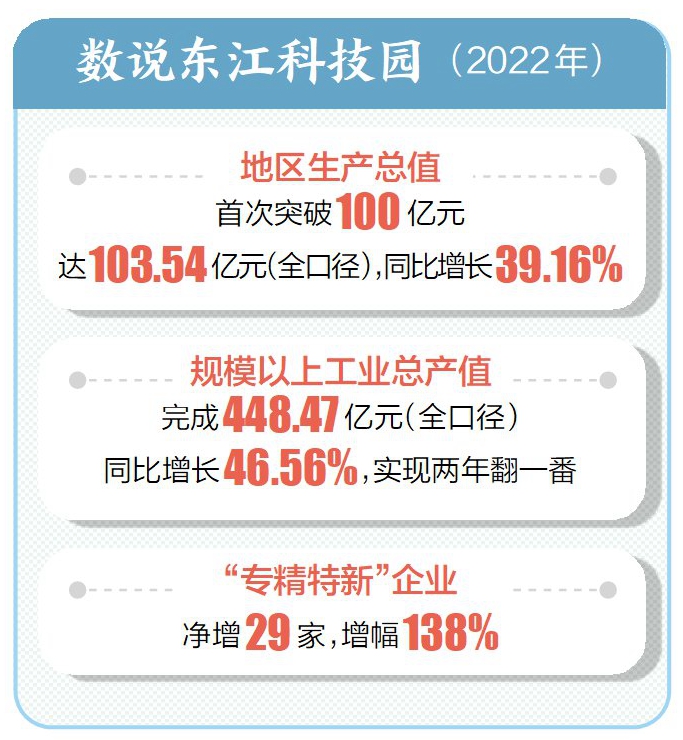 創(chuàng)新是持續(xù)發(fā)展的不竭動力。東江科技園堅持創(chuàng)新驅(qū)動發(fā)展戰(zhàn)略,扎實有效推進高新技術企業(yè)和“專精特新”企業(yè)引進培育,全力打造企業(yè)“星月同輝”的發(fā)展格局。2022年,園區(qū)高新技術企業(yè)突破百家大關,達115家,增長26.67%,高新技術企業(yè)占規(guī)上工業(yè)企業(yè)數(shù)量77.3%,高新技術企業(yè)產(chǎn)值占規(guī)上工業(yè)總產(chǎn)值比重達80.26%;“專精特新”企業(yè)達50家,凈增29家,增幅138%。創(chuàng)新要素加快在東江科技園聚集,創(chuàng)新驅(qū)動迸發(fā)新動能持續(xù)加強。