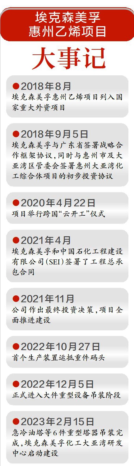 2月15日,總投資超100億美元的埃克森美孚惠州乙烯項目工程再傳捷報:急冷油塔等6件重型塔器吊裝完成,為項目施工建設(shè)提前完工打下堅實基礎(chǔ);?松梨诨ご髞啚逞邪l(fā)中心啟動建設(shè),成為埃克森美孚在北美總部以外首個配備中試裝置、融合產(chǎn)品研發(fā)及工藝開發(fā)的綜合性研發(fā)中心。
