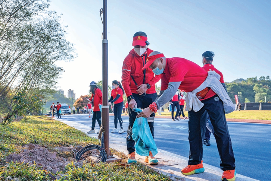 志愿者們?cè)诩ち骺铀畮?kù)桃花源休閑運(yùn)動(dòng)生態(tài)公園撿跑;葜輺|江圖片社供圖