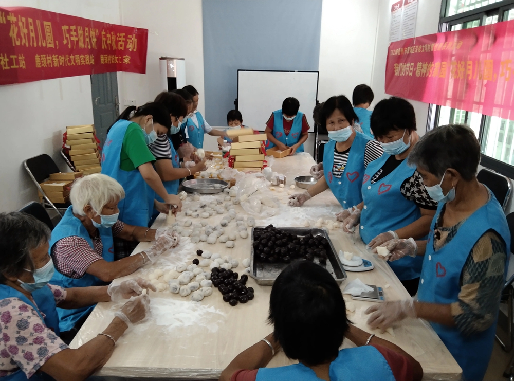 活動(dòng)當(dāng)天,“雙百”社工和志愿者們?cè)缭鐏?lái)到鹿頸村中的活動(dòng)室,打掃衛(wèi)生、布置好場(chǎng)地、觀看冰皮月餅的制作過程,然后分工合作,在大家的共同努力下制作了800個(gè)月餅。隨后,把制作好的月餅分裝,再由志愿者和“雙百”社工分批把剛出爐的月餅送給村中的困難群眾手中。