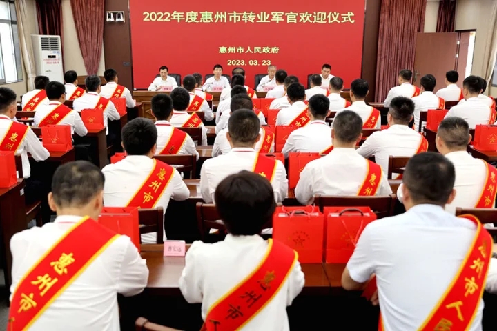 3月23日,2022年度惠州市轉(zhuǎn)業(yè)軍官歡迎儀式在市委黨校舉行。市退役軍人事務(wù)局、市委黨校相關(guān)負(fù)責(zé)人以及52名2022年度轉(zhuǎn)業(yè)軍官參加儀式。