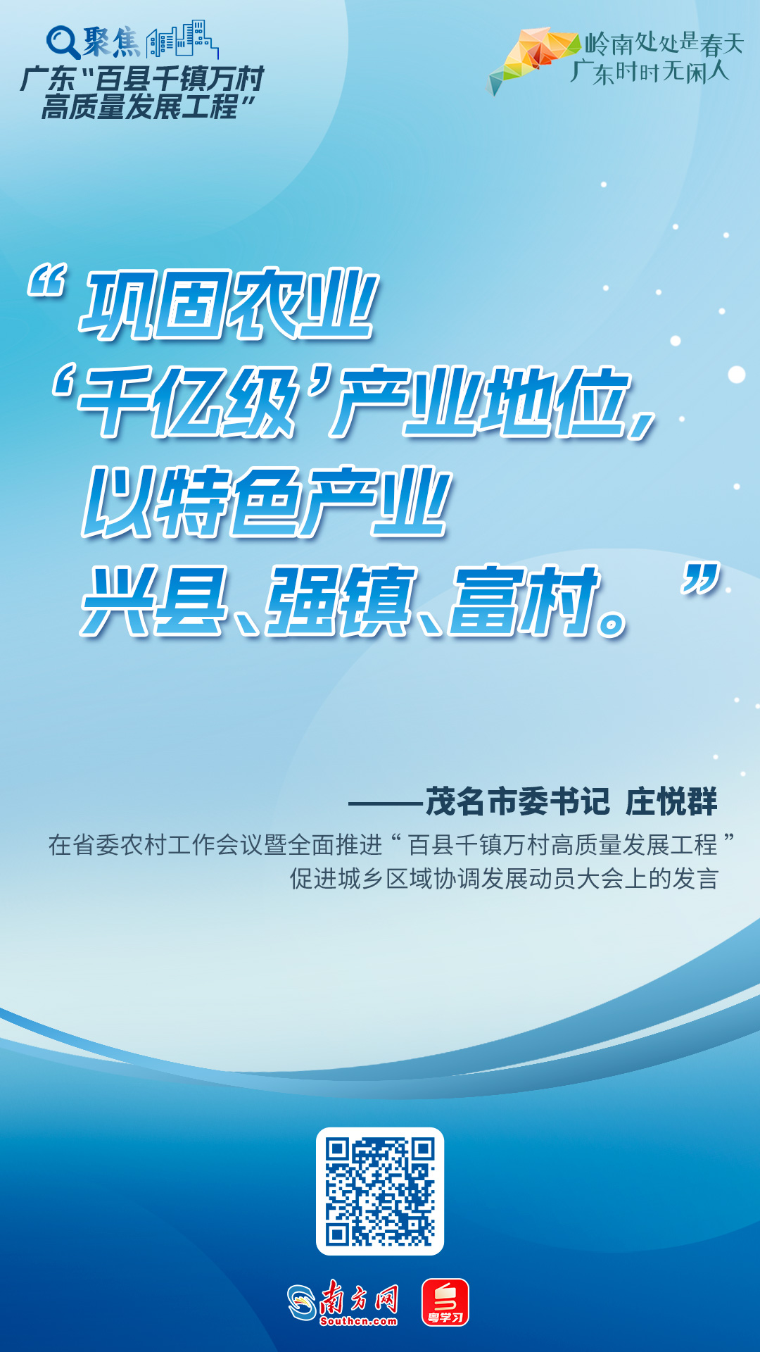 茂名市委書記莊悅?cè)涸跁习l(fā)言時提到,茂名是全省農(nóng)業(yè)農(nóng)村大市,城鄉(xiāng)發(fā)展不平衡、不協(xié)調(diào)是高質(zhì)量發(fā)展的突出短板。廣東省委實施“百千萬”工程,為茂名加快城鄉(xiāng)協(xié)調(diào)發(fā)展注入強勁動力。茂名將錨定目標,堅持工作項目化、清單化抓落實,力爭在市域發(fā)展、縣域振興中走在粵東粵西粵北前列。