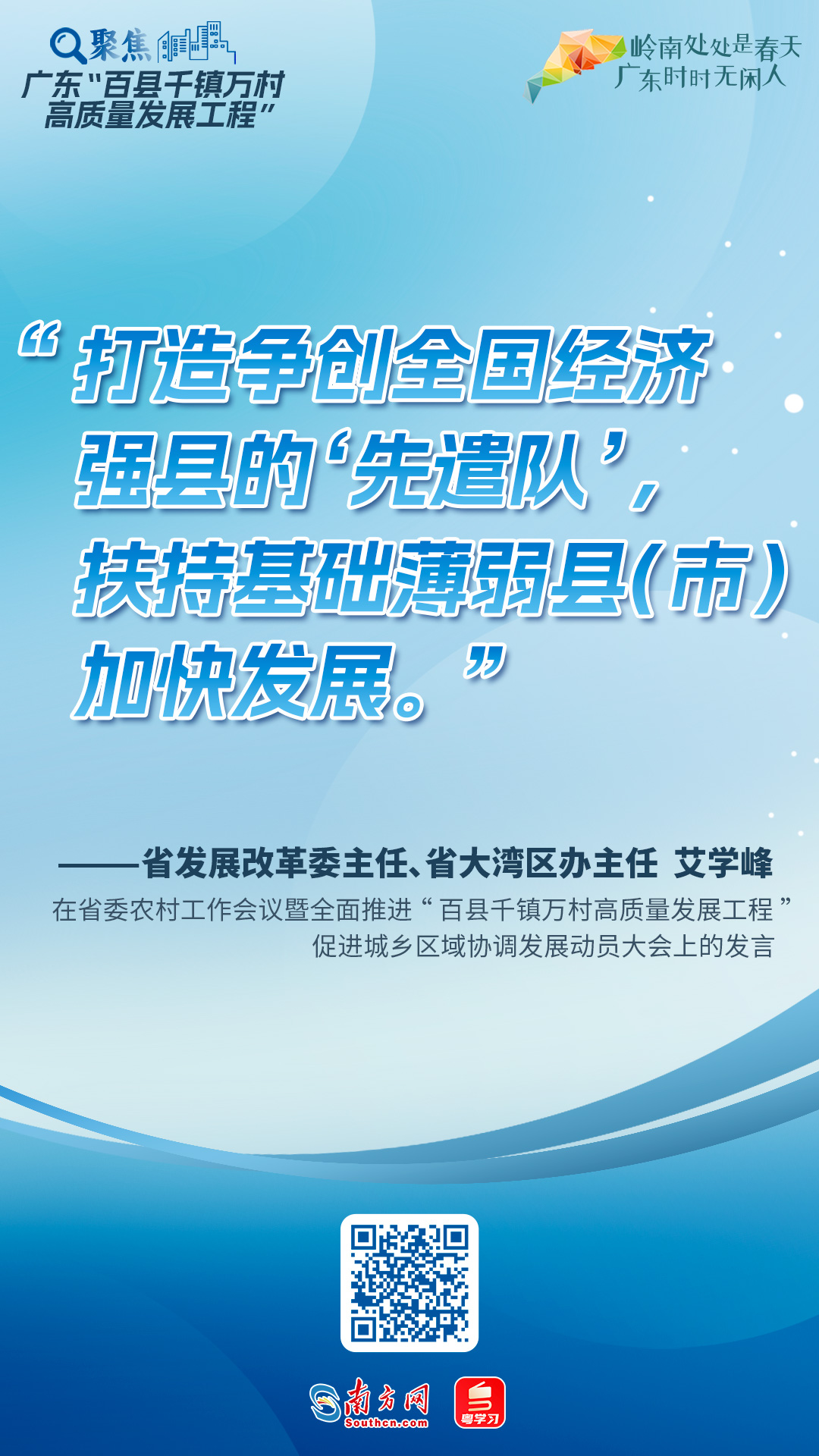 省發(fā)展改革委主任、省大灣區(qū)辦主任艾學峰表示,發(fā)展改革部門作為縣域經(jīng)濟工作專班的牽頭單位,將牢記使命、履職盡責,全力落實百千萬工程指揮部的各項工作部署,扎實推動縣域經(jīng)濟高質(zhì)量發(fā)展。