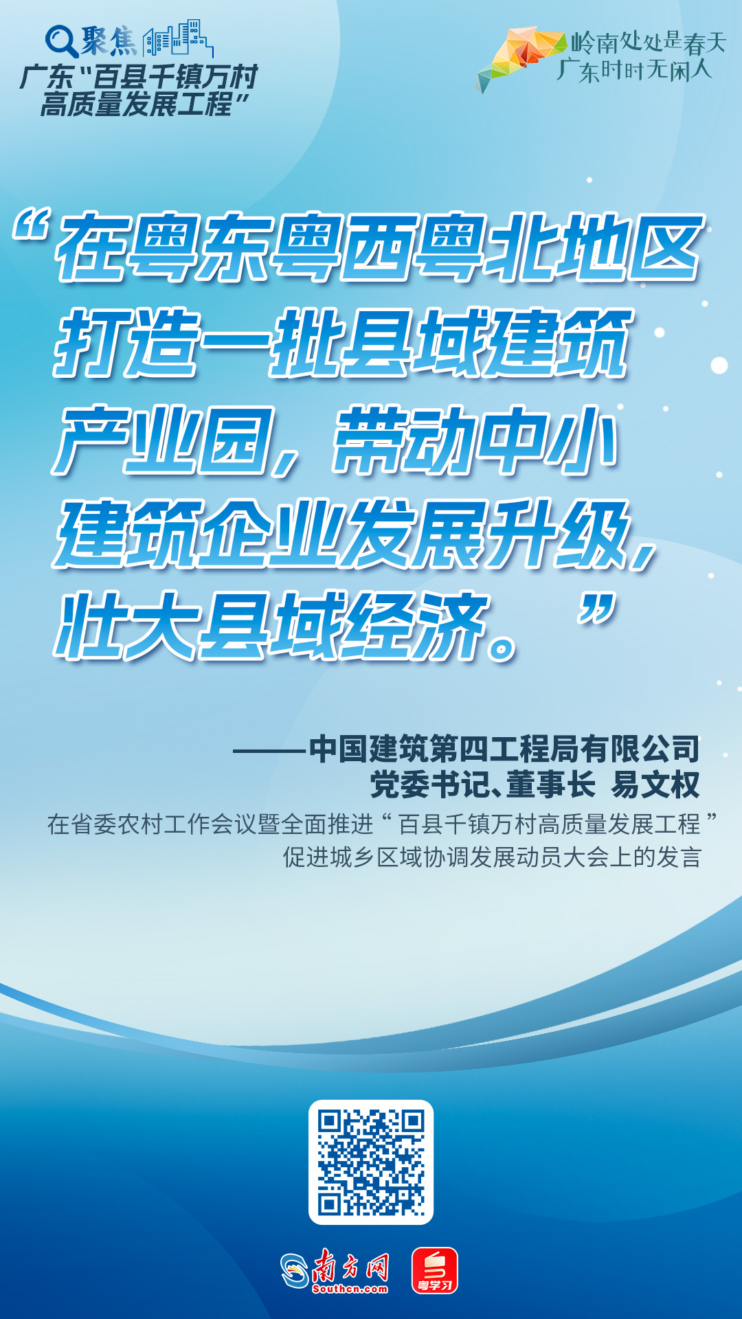 中建四局還將加大在廣東省的投資力度,特別是充分發(fā)揮建筑業(yè)“鏈主”的影響力和號召力,帶動建材、設(shè)備、物流等上下游“子鏈”及優(yōu)質(zhì)合作資源投向縣鎮(zhèn)村,在粵東粵西粵北地區(qū)打造一批縣域建筑產(chǎn)業(yè)園,帶動中小建筑企業(yè)發(fā)展升級,壯大縣域經(jīng)濟。(詳細>>)