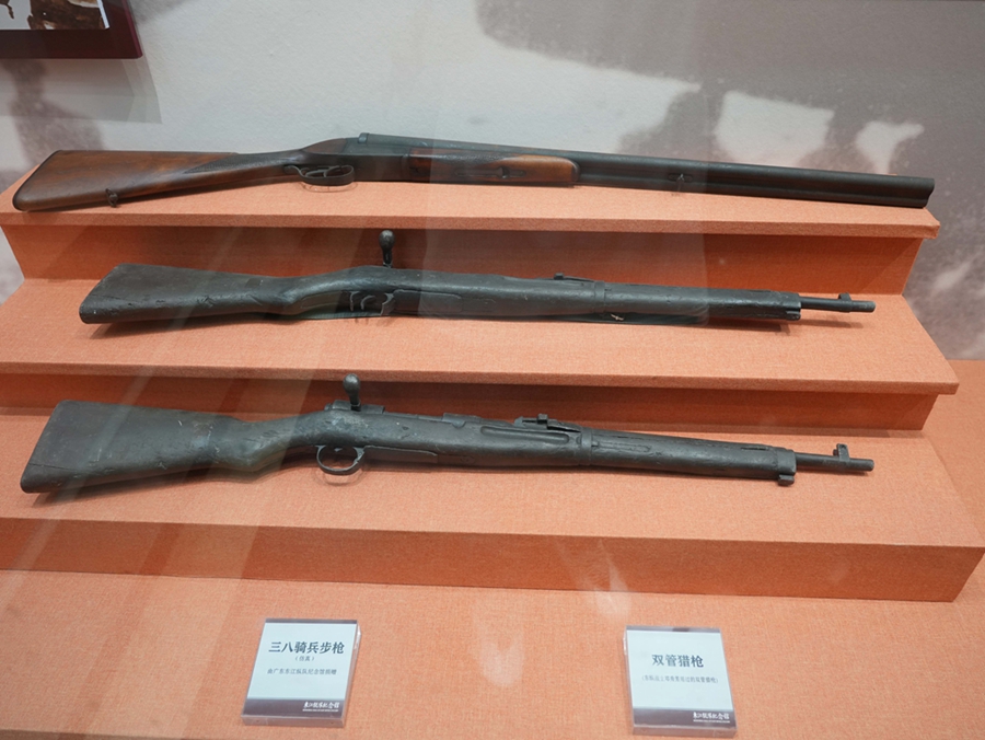 上一:雙管獵槍(東縱戰(zhàn)士鄧秀芳用過的雙管獵槍),下二下三:三八騎兵步槍(仿真)(由廣東東江縱隊(duì)紀(jì)念館捐贈(zèng))。