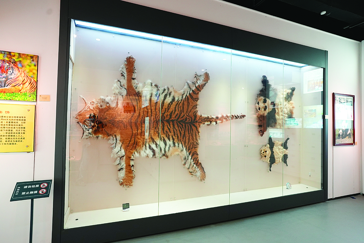 緝私動(dòng)物皮系列展區(qū)中的老虎皮與熊貓皮。