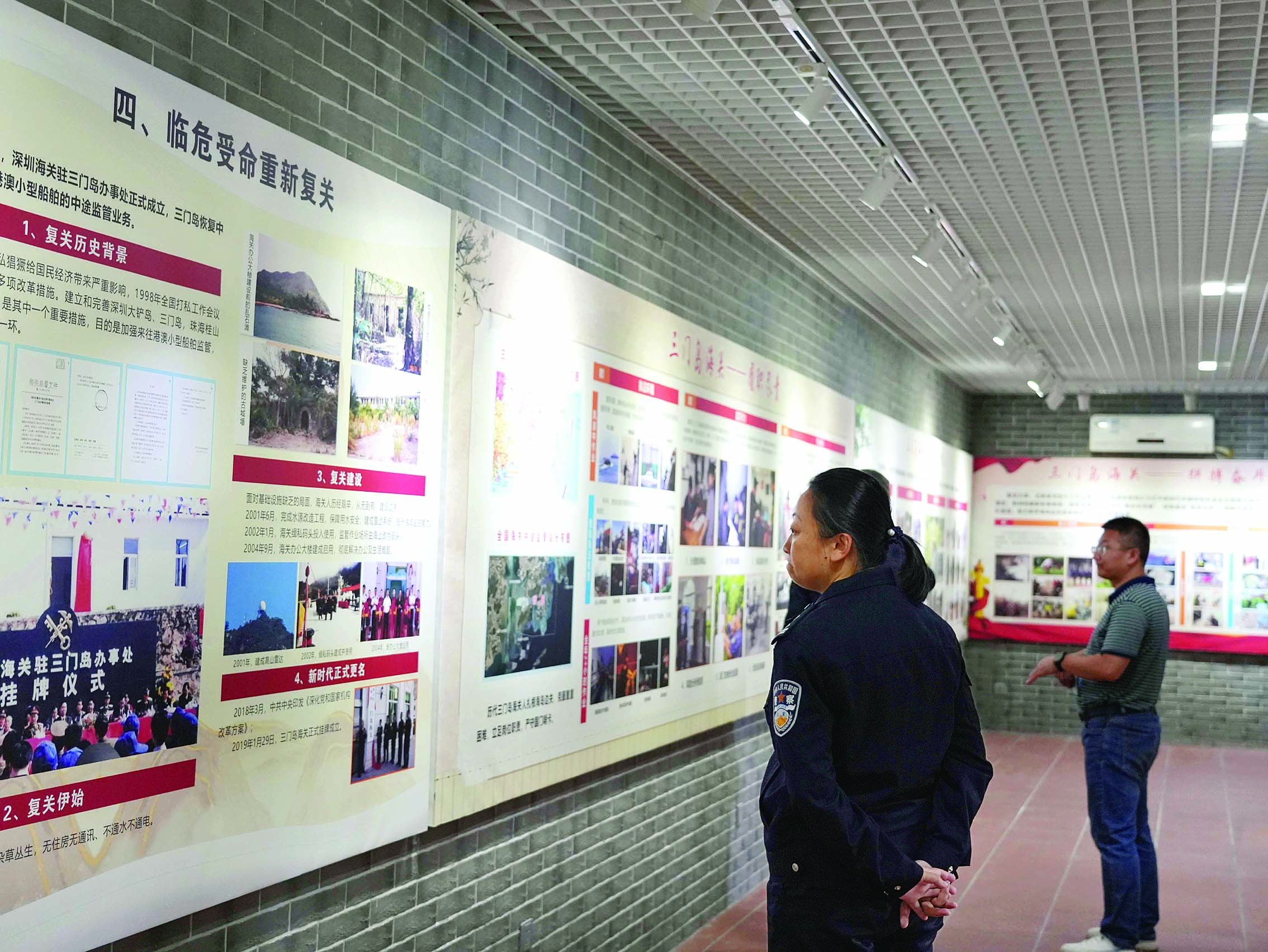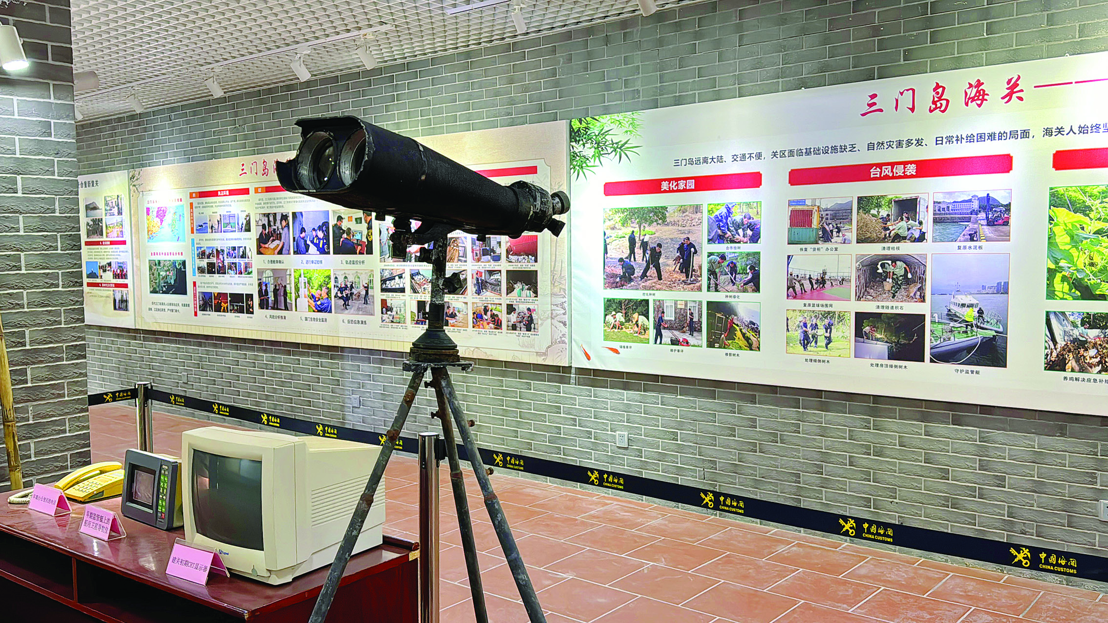 走進(jìn)三門關(guān)史展覽室,墻上圖文并茂展示了三門島海關(guān)從清代開設(shè)關(guān)廠,一直到近年來科技助力海關(guān)開展進(jìn)口監(jiān)管的歷史脈絡(luò)。館內(nèi)還展有建關(guān)初期使用的閘門、監(jiān)管船舶的瞭望鏡、監(jiān)管艇上的船用衛(wèi)星導(dǎo)航儀等老物件,生動展現(xiàn)了海關(guān)監(jiān)管技術(shù)的傳承和發(fā)展。