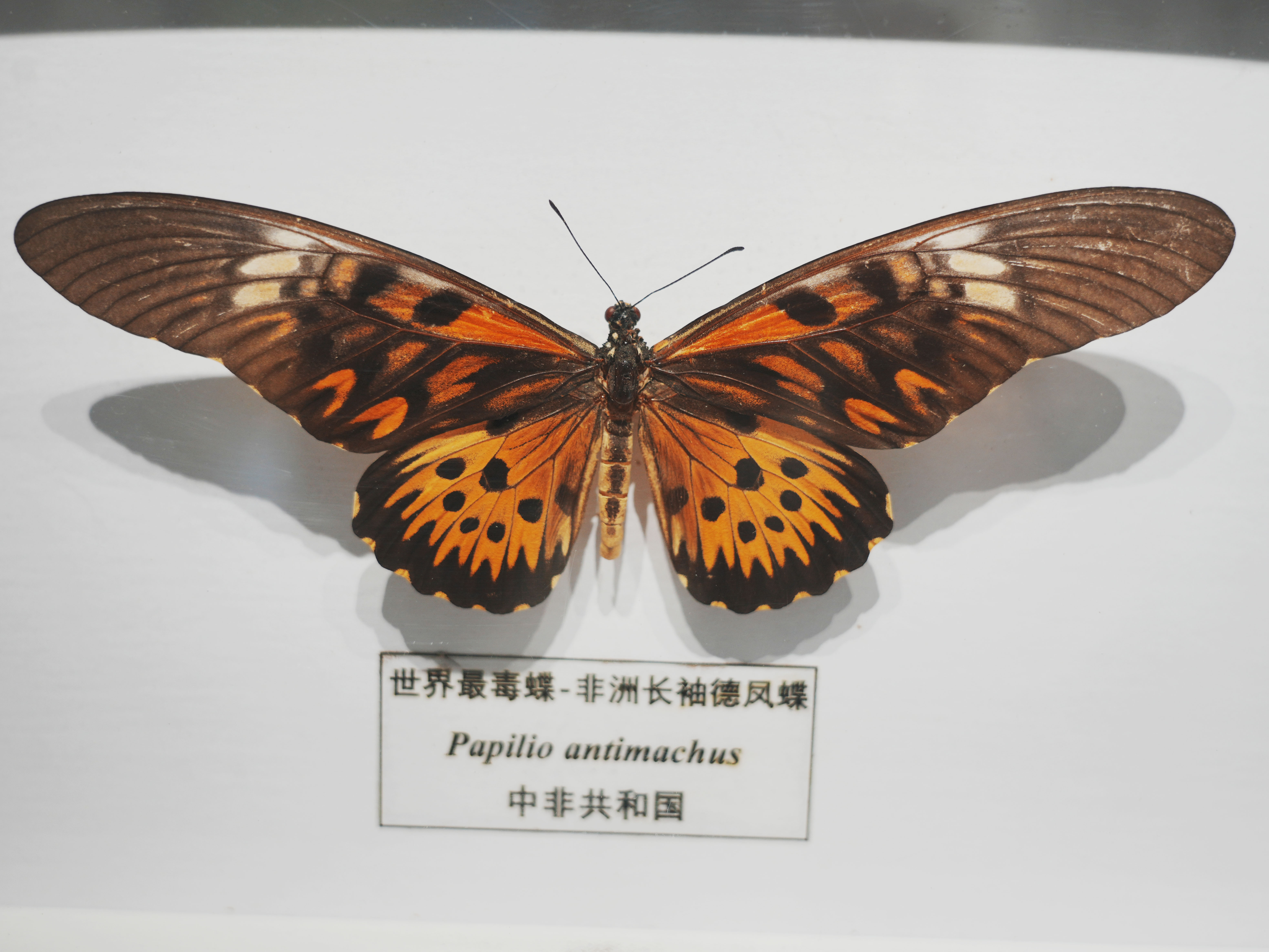 來到昆蟲標本和活體展示區(qū),這是館內(nèi)的精華部分,鱗翅目、鞘翅目等21個目的昆蟲標本琳瑯滿目,每一個標本都是一件藝術(shù)品。其中,展陳的8個“世界之最”昆蟲標本尤其引人注目,它們是中國的“奔跑速度最快昆蟲”金斑虎甲、“世界振翼最慢蝶”金鳳蝶,秘魯?shù)摹白畲蠡认x”領(lǐng)袖花癩蝗、“世界最美蝶”光明女神閃蝶,馬來西亞的“世界最重竹節(jié)蟲”扁竹節(jié)蟲、中非的“世界最毒蝶”非洲長袖德鳳蝶(又名非洲長翅鳳蝶)、厄瓜多爾的“世界最大兜蟲”長戟大兜蟲以及澳大利亞的“世界最美鍬甲”彩虹鍬甲。
