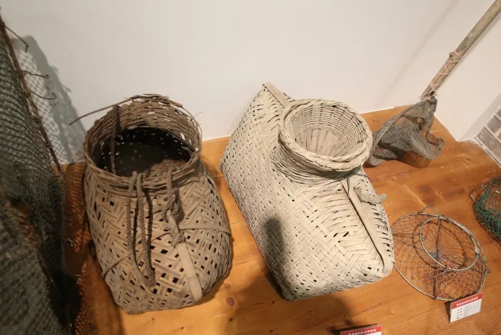 目前,展覽館里展出了近200件漁家老舊物件,這些物件大都來自當(dāng)?shù)貪O民的自發(fā)捐贈。這些物件基本囊括了漁民生產(chǎn)生活的主要方面,有船上使用的魚燈,還有不同年代各式魚簍、蝦簍,單是釣鉤就林林總總各式各樣,無不顯示著漁民的勤勞和智慧。除了生產(chǎn)工具,還有鄉(xiāng)土婚俗文化展示,在漁家婚嫁展示柜里,陳列著80年代漁家新郎新娘結(jié)婚穿戴的服飾和一些結(jié)婚小物件,有紅色的行李箱、鏡子、首飾盒等,上面都貼著紅紅的“雙喜”剪紙,“我們的奶奶輩以前結(jié)婚就是這樣坐漁船來的,現(xiàn)在不用坐船了,但我們還是跳劃槳舞、漁歌對唱,這些習(xí)俗一直保留到現(xiàn)在!眲⒒壑艺f。