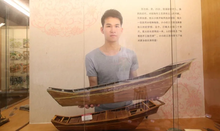 在古物中間還有個“新品”,一條長近1米的木質(zhì)漁船模型,單獨占據(jù)一個展柜,“這是我們新村漁民后代‘90后’蘇志輝,根據(jù)家里船的樣子制作的!眲⒒壑易院赖亟榻B,蘇志輝從小在新村長大,對船有著特殊的感情,制船技藝精湛,在這位年輕的手工船藝師心中,小小的工藝船寄托了他對家鄉(xiāng)的無限熱愛。
