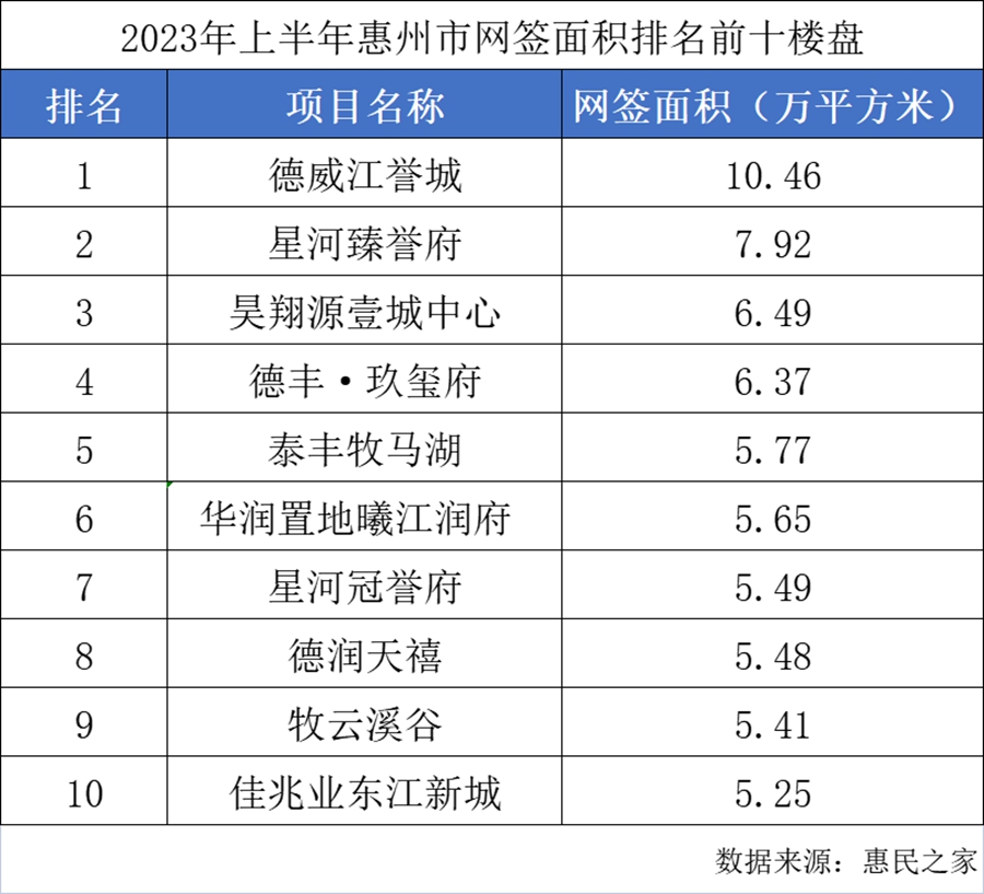 惠民之家數(shù)據(jù)研究中心公布數(shù)據(jù)顯示,2023年上半年惠州市網(wǎng)簽面積排名前十的樓盤分別是德威江譽城(10.46萬㎡)、星河臻譽府(7.92萬㎡)、昊翔源壹城中心(6.49萬㎡)、德豐·玖璽府(6.37萬㎡)、泰豐牧馬湖(5.77萬㎡)、華潤置地曦江潤府(5.65萬㎡)、星河冠譽府(5.49萬㎡)、德潤天禧(5.48萬㎡)、牧云溪谷(5.41萬㎡)、佳兆業(yè)東江新城(5.25萬㎡)。
