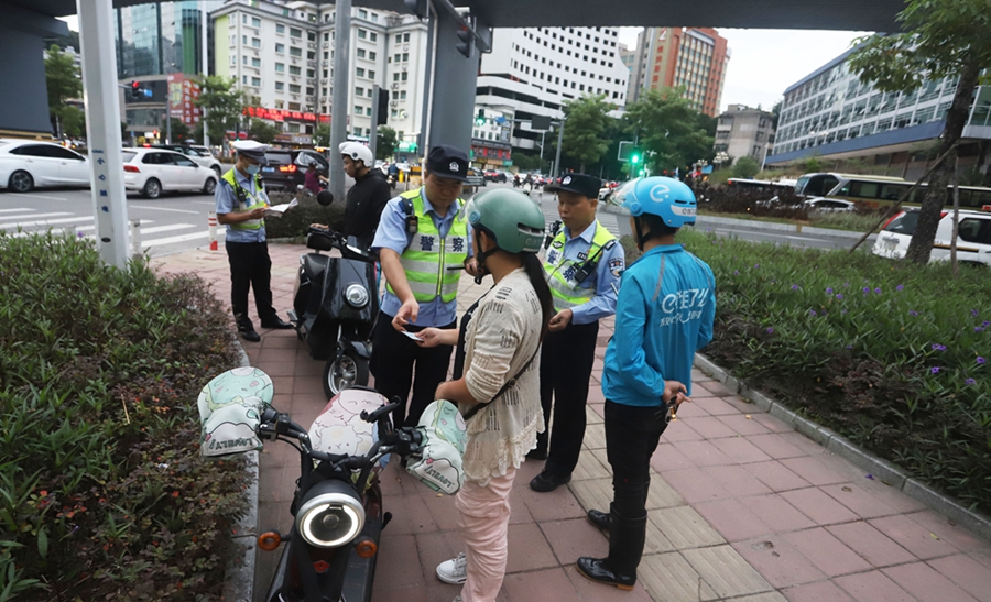 當(dāng)日下午5時(shí)許,記者在市區(qū)鵝嶺南路與鵝嶺西路交會(huì)路口發(fā)現(xiàn),一些“摩電”駕乘人員還是存在不戴安全頭盔、隨意變道、逆行等交通違法行為。不久,一輛電動(dòng)自行車沿鵝嶺西路由西往東行駛,駕乘人員因未佩戴安全頭盔被執(zhí)勤交警攔下進(jìn)行教育、處罰!邦^盔忘在家里了,下次一定注意。”駕駛員王先生認(rèn)為,駕駛摩托車、電動(dòng)自行車不戴安全頭盔,確實(shí)有一定的危險(xiǎn)性。