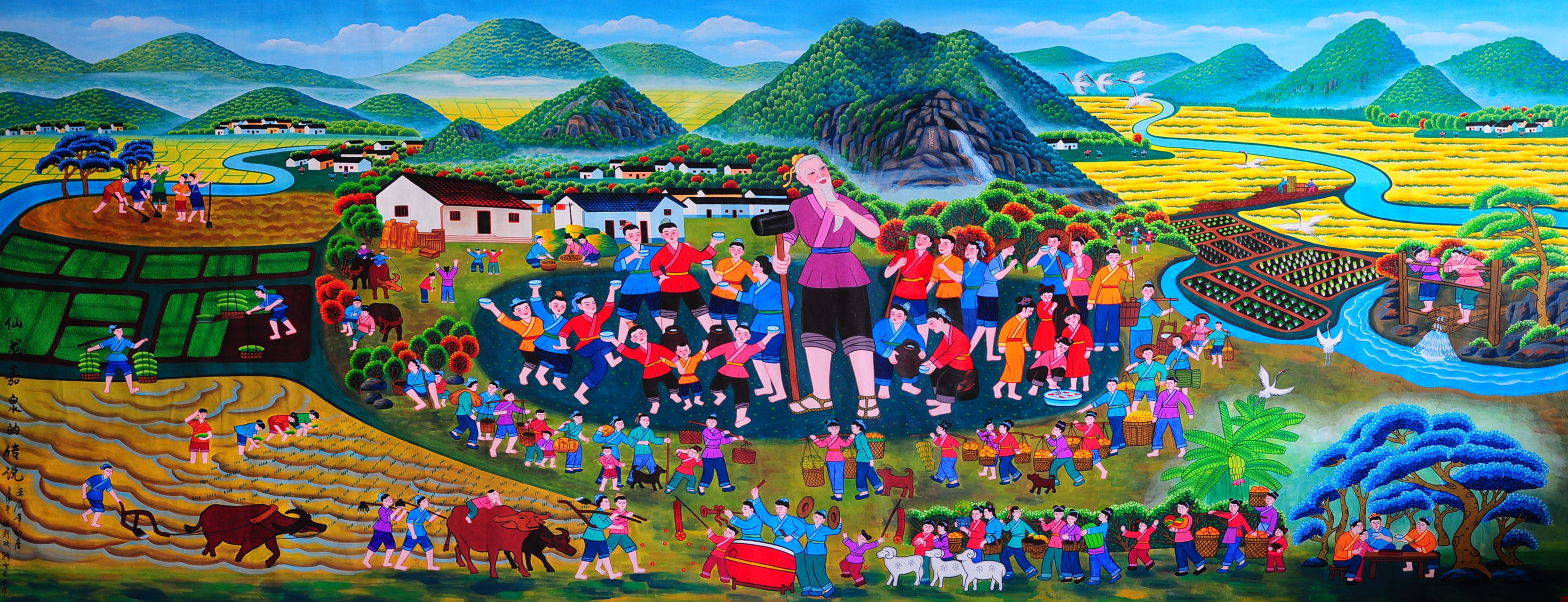龍門農(nóng)民畫《仙龍嘉泉的傳說(shuō)》,展現(xiàn)王賓風(fēng)情。 黃偉平、梁彩歡、駱雪芳繪;葜萑?qǐng)?bào)記者侯縣軍 翻拍