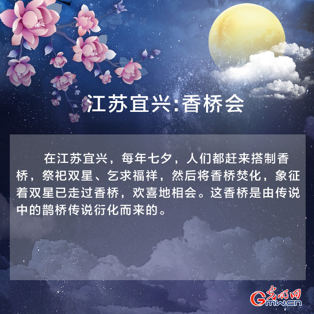 在江蘇宜興,每年七夕,人們都趕來搭制香橋,祭祀雙星、乞求福祥,然后將香橋焚化,象征著雙星已走過香橋,歡喜地相會(huì)。這香橋是由傳說中的鵲橋傳說衍化而來的。