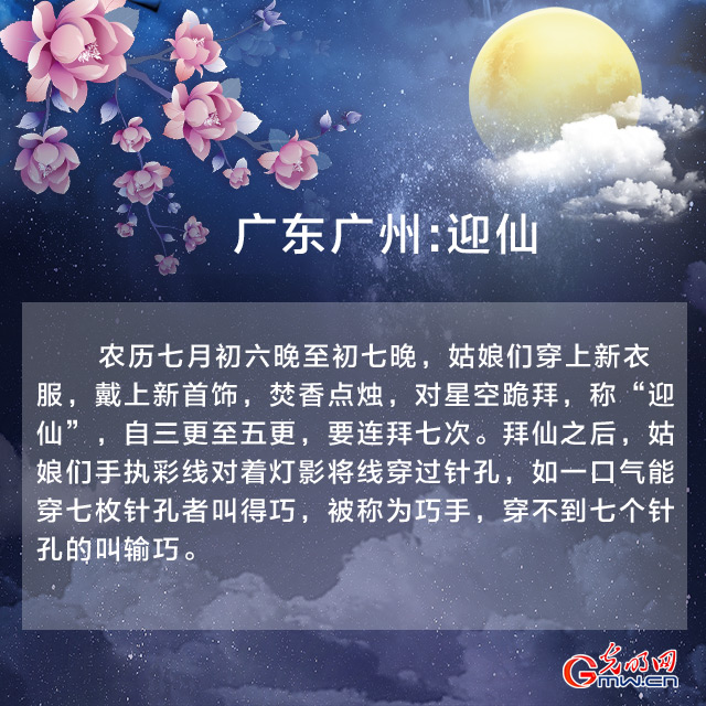 農(nóng)歷七月初六晚至初七晚,姑娘們穿上新衣服,戴上新首飾,焚香點(diǎn)燭,對星空跪拜,稱為“迎仙”,自三更至五更,要連拜七次。拜仙之后,姑娘們手執(zhí)彩線對著燈影將線穿過針孔,如一口氣能穿七枚針孔者叫得巧,被稱為巧手,穿不到七個(gè)針孔的叫輸巧。