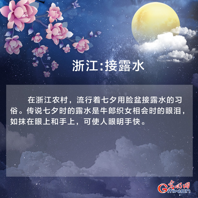 浙江農(nóng)村,流行著七夕用臉盆接露水的習(xí)俗。傳說七夕節(jié)時(shí)的露水是牛郎織女相會(huì)時(shí)的眼淚,如抹在眼上和手上,可使人眼明手快。