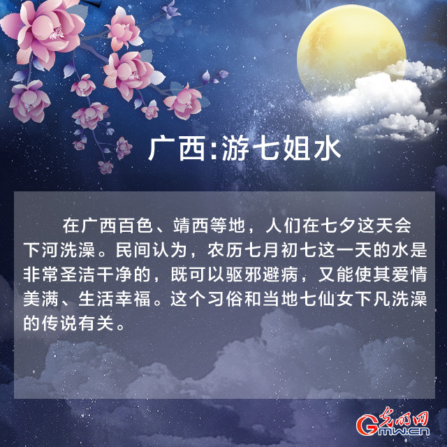 在廣西百色、靖西等地,人們在七夕這天會(huì)下河洗澡。民間認(rèn)為,農(nóng)歷七月初七這一天的水是非常圣潔干凈的,既可以驅(qū)邪避病,又能使其愛情美滿、生活幸福。這個(gè)習(xí)俗和當(dāng)?shù)仄呦膳路蚕丛璧膫髡f有關(guān)。