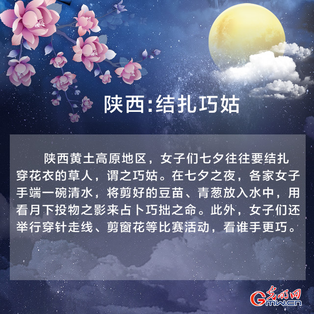 陜西黃土高原地區(qū),女子們七夕往往要結(jié)扎穿花衣的草人,謂之巧姑。在七夕之夜,各家女子手端一碗清水,將剪好的豆苗、青蔥放入水中,用看月下投物之影來占卜巧拙之命。此外,女子們還舉行穿針走線、剪窗花等比賽活動(dòng),看誰手更巧。