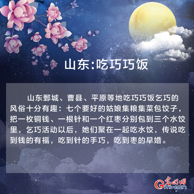 山東鄄城、曹縣、平原等地吃巧巧飯乞巧的風(fēng)俗十分有趣:七個(gè)要好的姑娘集糧集菜包餃子,把一枚銅錢、一根針和一個(gè)紅棗分別包到三個(gè)水餃里,乞巧活動(dòng)以后,她們聚在一起吃水餃,傳說吃到錢的有福,吃到針的手巧,吃到棗的早婚。