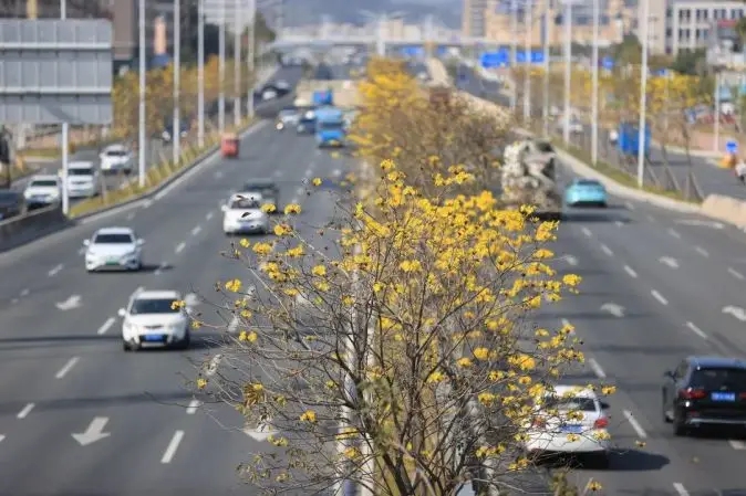 金龍大道快速路上的黃花風(fēng)鈴木迎春開(kāi)放;葜萑?qǐng)?bào)記者王建橋攝