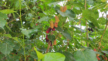這個時候還是桑葚收成的季節(jié)。摘下一顆紅得發(fā)紫的桑葚,長條的形狀與毛毛蟲頗有幾分相似。放入口中輕輕一咬,色如紅酒的果汁從飽滿的顆粒中飛濺而出,清甜的味道透過味蕾瞬間傳遞至大腦。桑葚還可以制成果醬、桑葚酒等副產(chǎn)品。