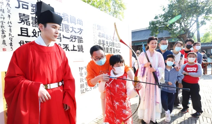 1月22日,“惠新年 書(shū)院雅集”古裝游園專場(chǎng)在豐湖書(shū)院舉行,市民游客體驗(yàn)射箭。惠州日?qǐng)?bào)記者鐘暢新 攝