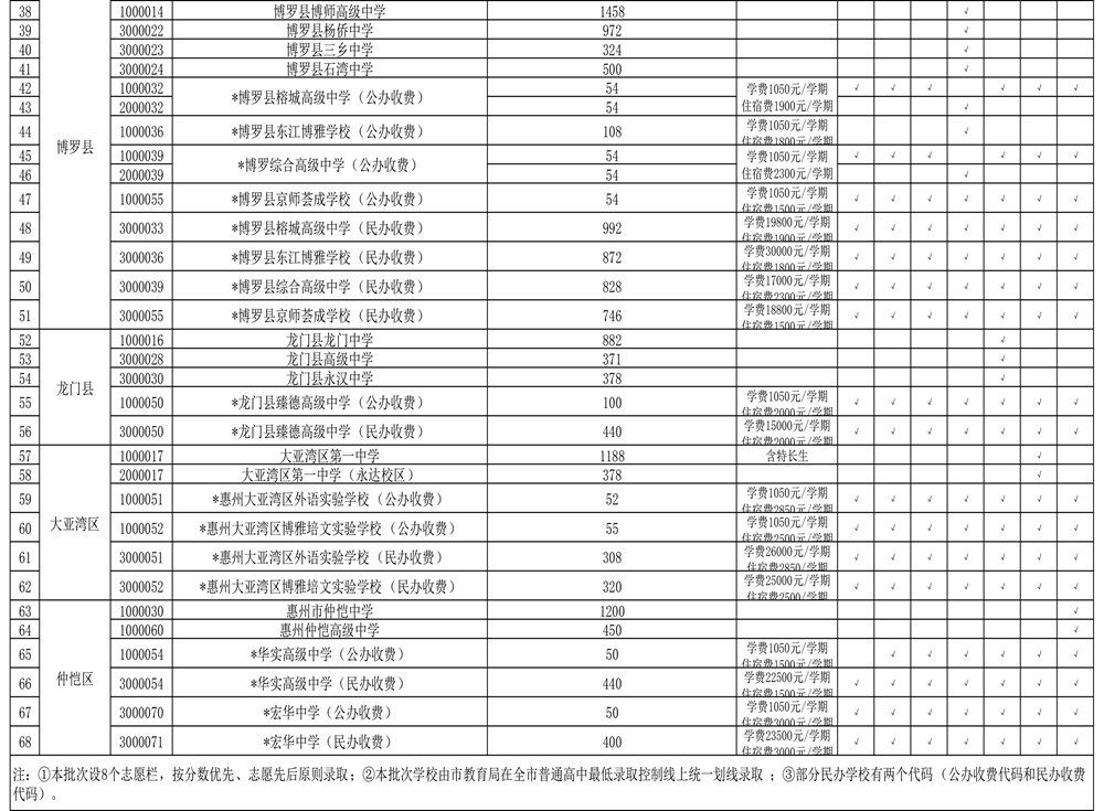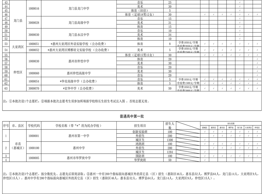 市實(shí)驗(yàn)中學(xué)北校區(qū)面向仲愷高新區(qū)招生30人,仲愷中學(xué)(惠州一中班)面向惠城區(qū)和仲愷高新區(qū)招生200人,仲愷高級(jí)中學(xué)(創(chuàng)新班)面向惠城區(qū)招生200人,惠陽區(qū)豐湖高級(jí)中學(xué)(公辦收費(fèi))面向惠城區(qū)招生50人,華實(shí)高級(jí)中學(xué)(公辦收費(fèi))面向惠城區(qū)招生50人。