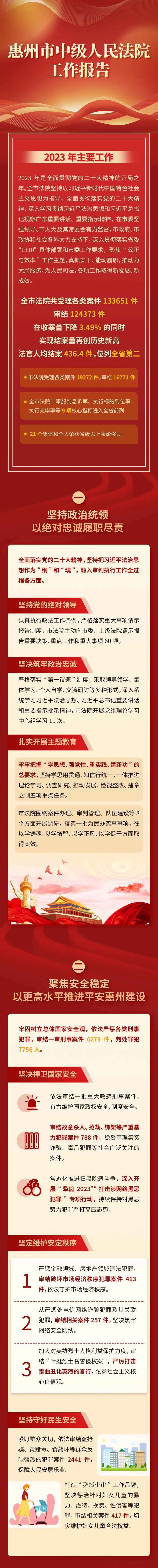 1月18日上午,惠州市第十三屆人民代表大會第四次會議第二次全體會議舉行。市中級人民法院負(fù)責(zé)人作惠州市中級人民法院工作報告。去年市中級人民法院工作有哪些亮點成績,今年有哪些重點安排?現(xiàn)在帶您一圖讀懂!