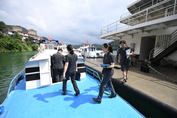 2023年7月19日,湖南省益陽市安化縣人民法院干警在柘溪客運碼頭登上“水上法庭”!八戏ㄍァ笨梢蚤_到離當事人更近的港口、岸邊,為群眾減輕訴累。新華社記者 薛宇舸 攝