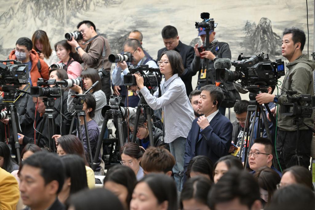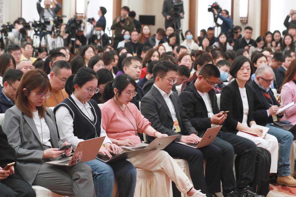 3月4日,十四屆全國人大二次會議在北京人民大會堂舉行新聞發(fā)布會。大會發(fā)言人婁勤儉就大會議程和人大工作相關(guān)問題回答中外記者的提問。這是記者在發(fā)布會上采訪。