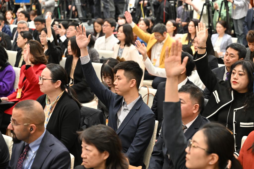 3月4日,十四屆全國人大二次會議在北京人民大會堂舉行新聞發(fā)布會。大會發(fā)言人婁勤儉就大會議程和人大工作相關(guān)問題回答中外記者的提問。這是記者舉手提問。