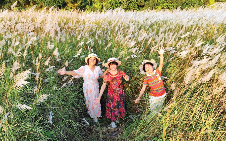 在位于惠城區(qū)汝湖鎮(zhèn)房村村的繽紛島,天空湛藍(lán)如洗,蘆葦隨風(fēng)搖曳,幾位阿姨置身蘆葦之中開心合影。