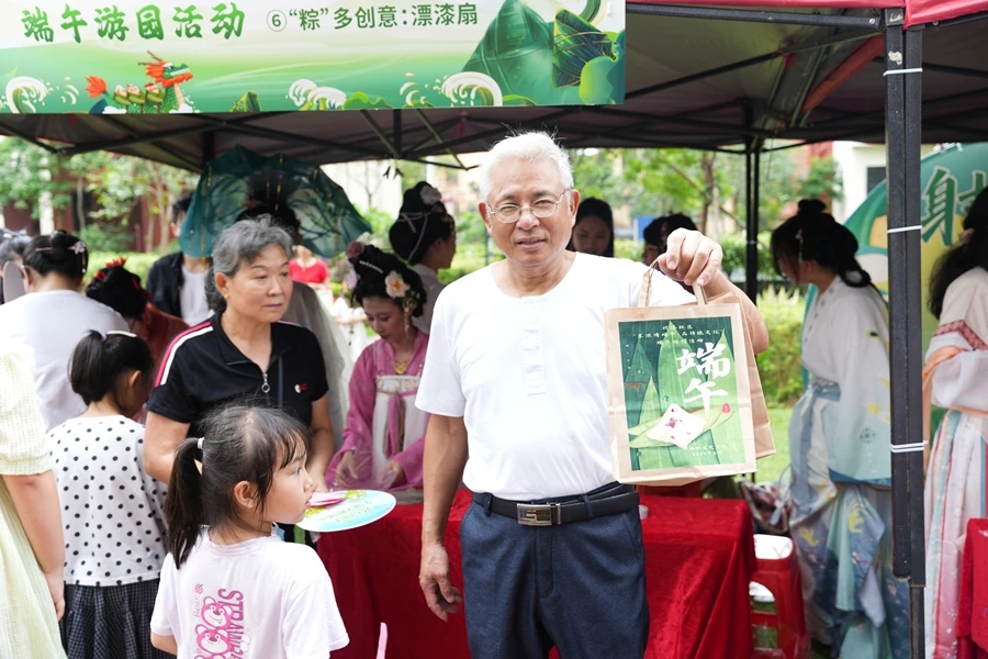 游園活動豐富多彩,包括漢服走秀、“品糖畫”、“射五毒”、“漂漆扇”、“食粽子”、“配香囊”等一系列端午文化民俗體驗(yàn)。廣袖高髻、曲裾輕舞,走秀隊(duì)伍展現(xiàn)了漢式禮儀、禮服、禮樂的魅力,帶領(lǐng)居民群眾穿越時(shí)空,領(lǐng)略漢服的獨(dú)特韻味。另一邊,民俗文化市集同樣備受追捧!安势崞谒嫔,在水面繪出圖案效果,再暈染在團(tuán)扇表面,形成自然天成的圖案,仿佛被施了魔法!鄙碇鴿h服的報(bào)到黨員耐心講解漂漆扇制作方法,激發(fā)了大家的創(chuàng)作熱情,大人和孩子們紛紛發(fā)揮想象力和創(chuàng)造力,制作出了一把把別具一格的創(chuàng)意漆扇。居民們還根據(jù)各種草藥的功效自由搭配,制作獨(dú)具端午傳統(tǒng)特色的香囊,裝有草藥的香囊,不僅具有避邪驅(qū)瘟的寓意,還能提神醒腦、防蚊驅(qū)蟲,散發(fā)著陣陣清香。