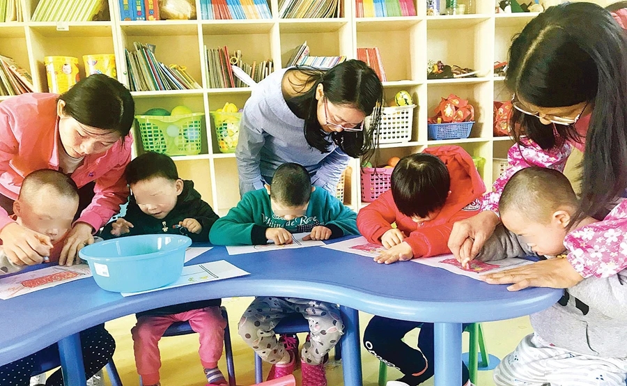 市兒童福利院老師指導孤殘兒童。 惠州東江圖片社供圖