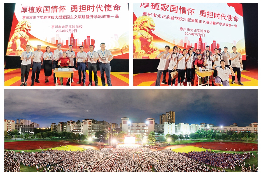 日前,惠州光正舉行了一場以“厚植家國情懷,勇?lián)鷷r代使命”為主題的愛國主義演講暨開學(xué)思政第一課教育活動。全校師生及家長懷著激動的心情齊聚操場,共同聆聽著名演講家蔡朝東的精彩演講。