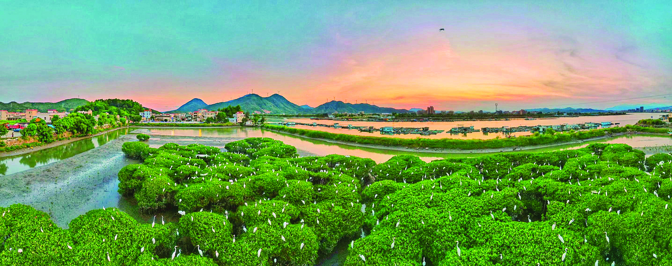 惠東縣鐵涌鎮(zhèn)油麻地村的灘涂上,連片的紅樹林正在蓬勃生長(zhǎng),郁郁蔥蔥。此前,當(dāng)?shù)匾呀ǔ苫輺|縣好招樓濕地公園一期。如今,紅樹林成為鷺鳥樂園,每到黃昏,便呈現(xiàn)“落霞與白鷺齊飛”“萬鳥歸巢”的美麗畫面。