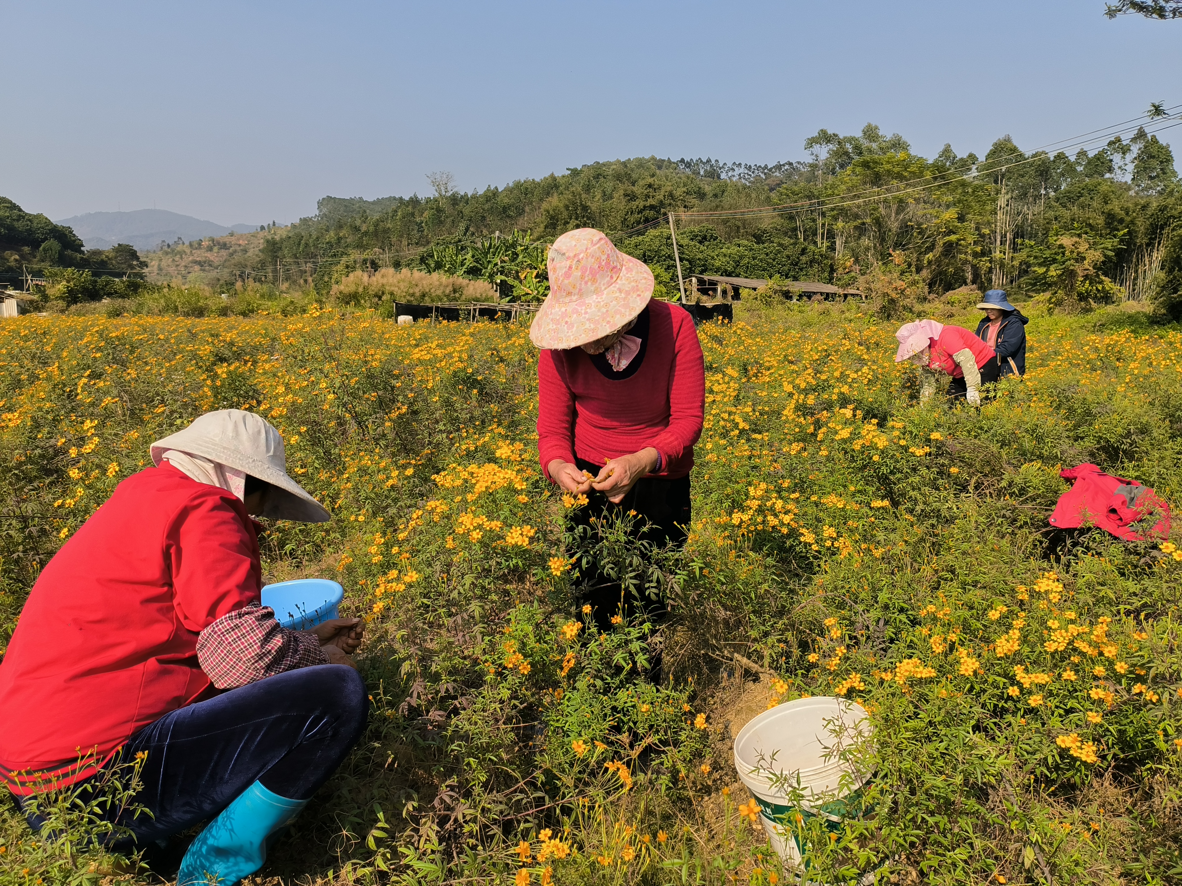 芳香萬壽菊花期有5個月長,每年的11月底就進入開花期及采摘期,5至7天采摘一輪,可采摘至次年4月。吳三毛聘請?zhí)锱拼宓拇迕駚聿烧头謷枷闳f壽菊,然后按重量現(xiàn)稱現(xiàn)結(jié)工錢給村民。高峰時期,吳三毛聘請的村民達到二三十人,由于該村留守中老年人較多,吳三毛聘請到的多為中老年人。