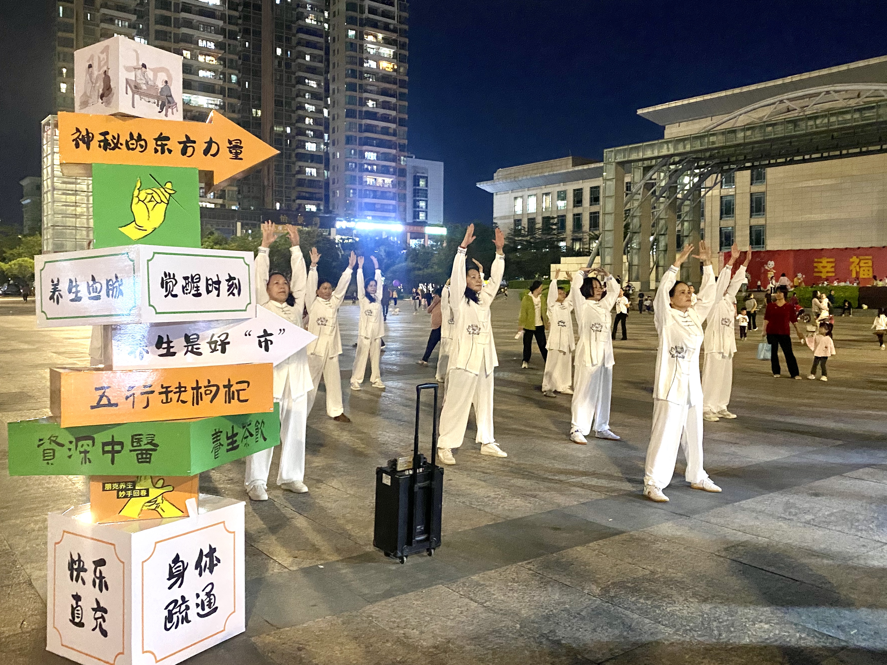 在八段錦健身操展演現(xiàn)場(chǎng),伴隨著悠長(zhǎng)舒緩的音樂,許多小朋友在醫(yī)護(hù)人員指導(dǎo)下操練起來,抬手、半蹲、提腳,一招一式有板有眼。此外,推拿、針灸、穴位按摩……現(xiàn)場(chǎng)吸引了一大批感興趣的街坊駐足體驗(yàn)。