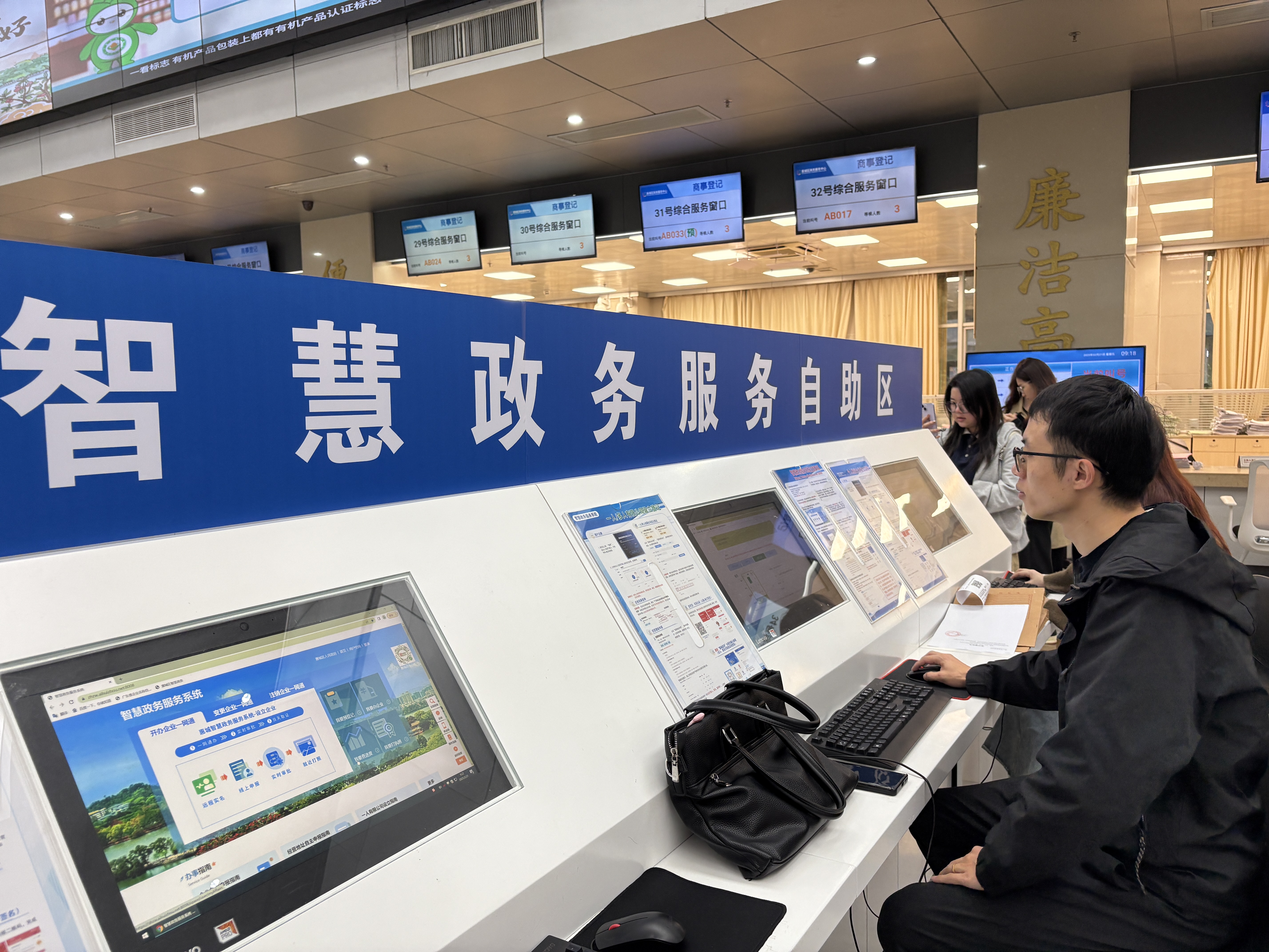 惠城區(qū)行政服務(wù)中心智慧政務(wù)服務(wù)自助區(qū)。