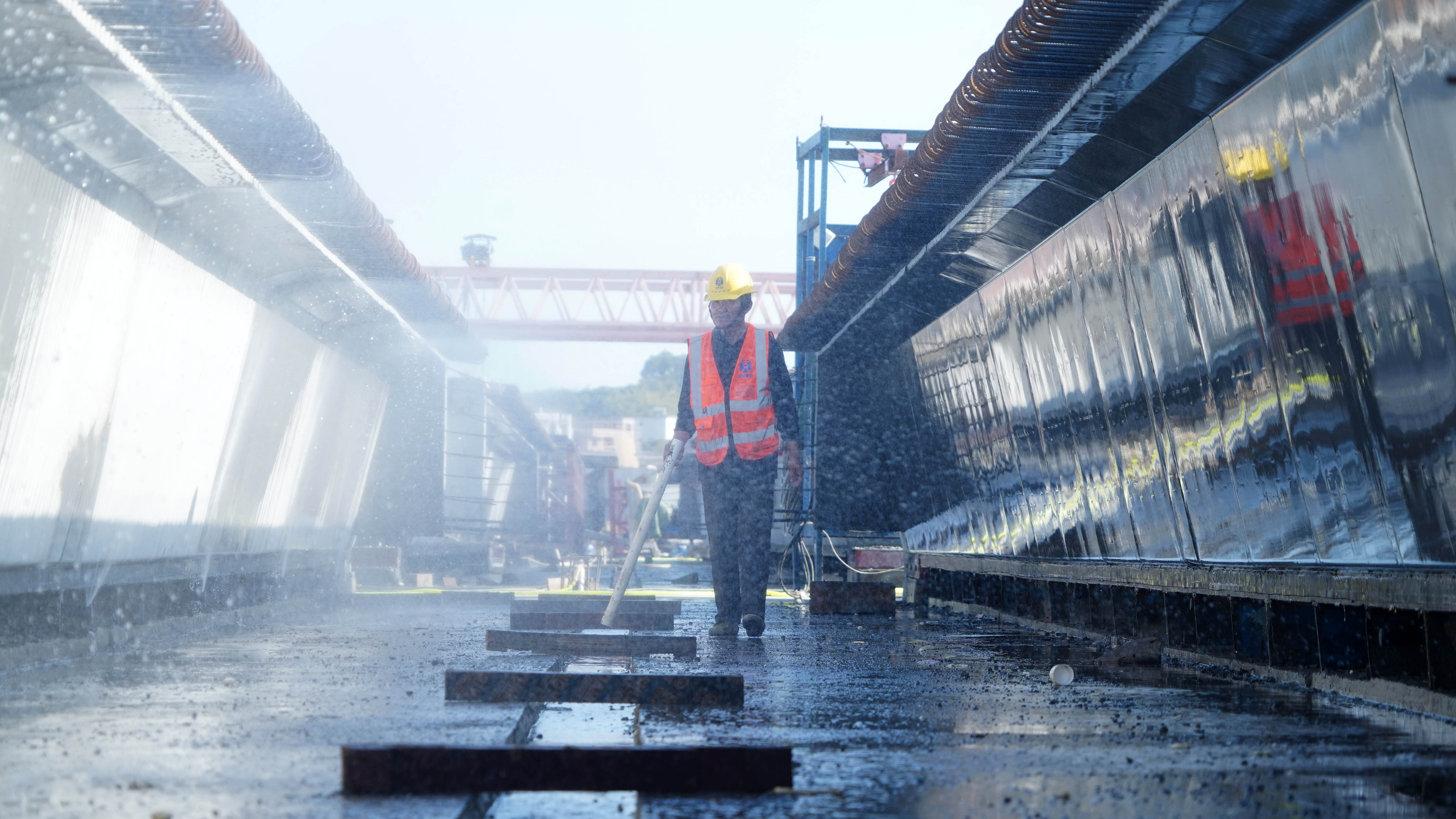 在7號(hào)制梁場,一片片預(yù)制梁整齊地?cái)[放在場內(nèi),工人正在進(jìn)行預(yù)制梁養(yǎng)護(hù)。