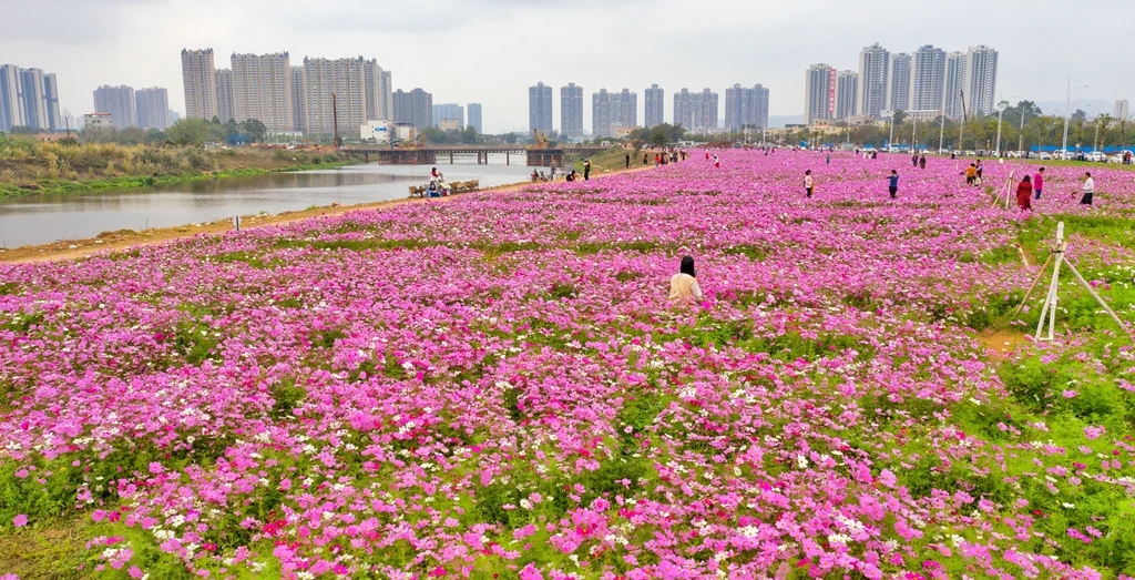 惠城區(qū)小金河大道路邊上有30畝格;ㄊ㈤_,吸引了許多游客觀賞打卡。