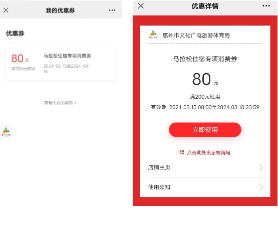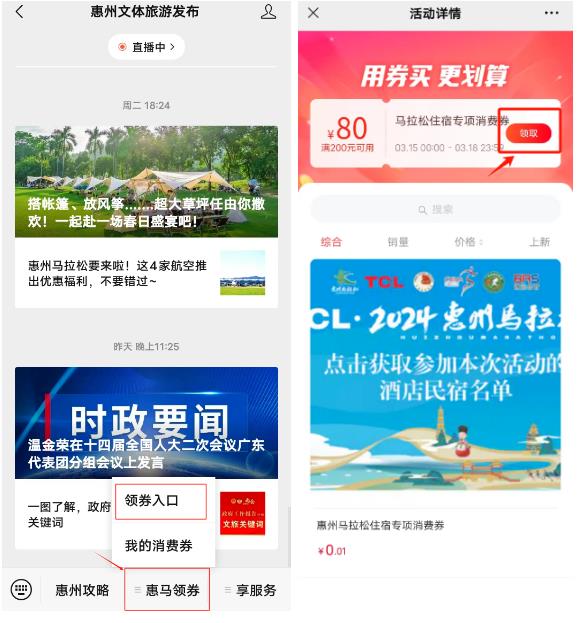 點(diǎn)擊“惠州文體旅游發(fā)布”公眾號(hào)底部菜單欄“惠馬領(lǐng)券”選擇“領(lǐng)券入口”,進(jìn)入活動(dòng)頁(yè)面,使用中簽手機(jī)號(hào)碼授權(quán)登錄,點(diǎn)擊“領(lǐng)取”即可。