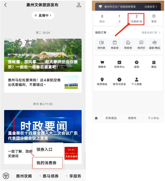 打開(kāi)“惠州文體旅游發(fā)布”公眾號(hào),點(diǎn)擊底部菜單欄“惠馬領(lǐng)券”選擇“我的消費(fèi)券”,點(diǎn)擊“優(yōu)惠券/碼”進(jìn)行使用。