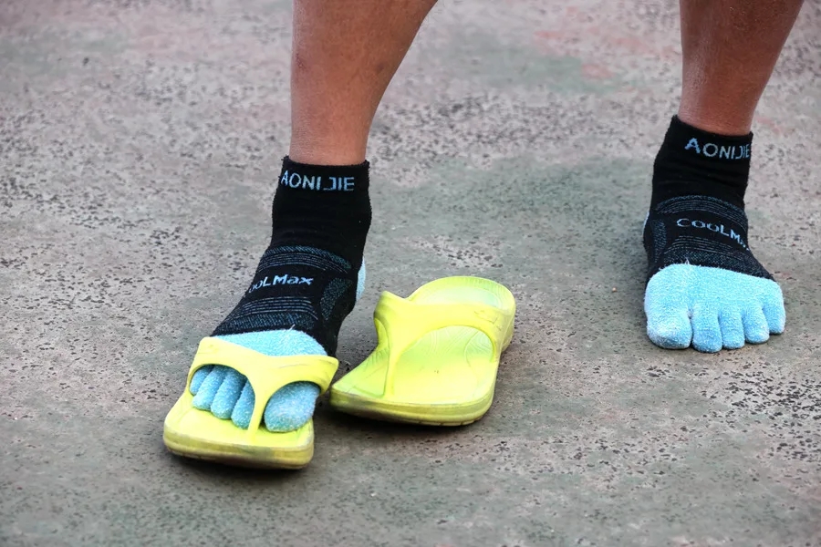 “一開始跑馬拉松我也是穿運(yùn)動(dòng)鞋,全程跑下來腳趾擠得很痛,于是在跑友的推薦下開始穿人字拖跑!庇(xùn)練結(jié)束后,馮建軍向記者展示他的拖鞋——一雙專門為跑步設(shè)計(jì)的運(yùn)動(dòng)氣墊人字拖,整個(gè)鞋身為橡膠一體制作,鞋后跟里有氣墊,可以起到減震作用。從2021年到現(xiàn)在,他都是穿這類人字拖跑步。