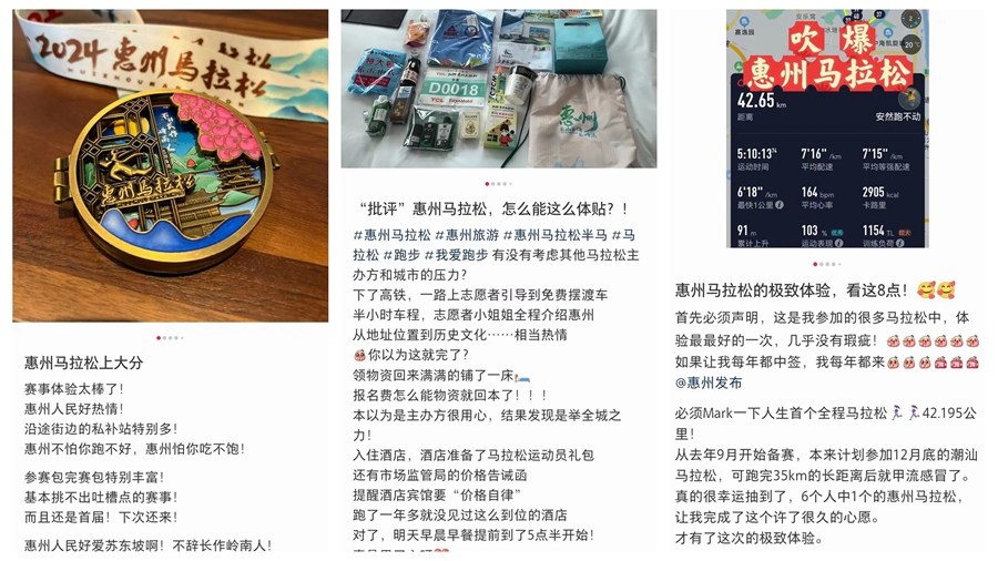 不少參賽選手在各大社交媒體上表揚(yáng)惠州的用心服務(wù),“惠州馬拉松贏麻了,組委會(huì)安排免費(fèi)半日游,以后‘惠馬’我都報(bào)。”“惠州馬拉松上大分,惠州人民好熱情,沿途補(bǔ)給站特別多,惠州不怕你跑不好,就怕你吃不飽!”“參賽包、完賽包特別豐富,挑不出槽點(diǎn),下次還來!”……